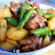 鸡腿、土豆、四季豆、姜、蒜、盐、鸡精、老抽、白糖。