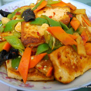老豆腐、黑木耳、青椒、胡萝卜、西芹、姜蒜、大葱、生抽、醋、豆瓣酱、鸡精。