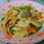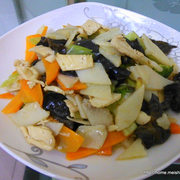 千张、肉、平菇、胡萝卜、青椒、姜、蒜、米酒、醋、生抽、盐、鸡精、水淀粉。