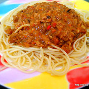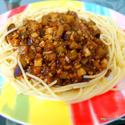 意大利面、肉末、茄子、姜、蒜、杏鲍菇、蚝油、番茄酱、辣椒油、老抽、生抽、米酒、米醋、冰糖、鸡精、盐、黄豆酱、水淀粉。