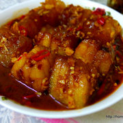 茄子、姜、蒜、生抽、冰糖、盐、米醋、蚝油、鸡精、生粉、豆瓣酱。