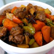 鸭、啤酒、胡萝卜、土豆、西芹、姜、蒜、花椒、八角、辣椒油、蚝油、生抽、老抽、料酒、米醋、盐、鸡精、冰糖、五香粉、胡椒粉。