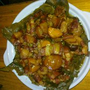 五花肉、板栗、水发香菇、荷叶、酱油、糖、味精、盐、香料、加饭酒。