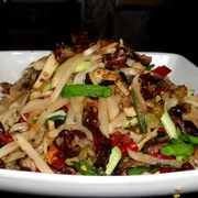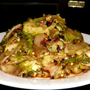猪瘦肉、角瓜、葱、菜籽油、盐、料酒、胡椒面、花椒粒、白糖、泡椒、泡姜、蒜、水淀粉、郫县豆瓣、鸡精。