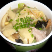 面粉、猪瘦肉、黄花、木耳、疙瘩白菜、黄豆芽、自制五香咸菜、平菇、香葱、姜丝、鸡蛋、火腿肠。