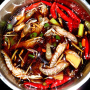 嘎巴虾、姜、蒜、香菜、葱白、干辣椒、小红尖椒、杭椒、花椒粒、八角、盐、一品鲜酱油、料酒、白酒、白糖。