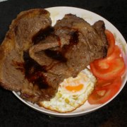 牛眼肉、黑椒烧汁、番茄、鸡蛋、青椒。