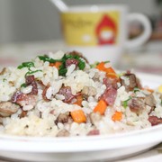 剩米饭、红萝卜、腊肠、牛肉、青蒜、油、盐。