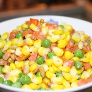 甜玉米、熟松子、豌豆、红萝卜、鲜牛奶、盐和油。