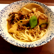 手擀面、蟹味菇、金针菇、杏鲍菇、口蘑、姜、小葱、盐、生抽、热水、菜籽油。