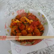 黄豆、红豆、绿豆、薏仁、炸里脊肉片、菜叶、面粉、鸭蛋、番茄酱。