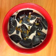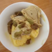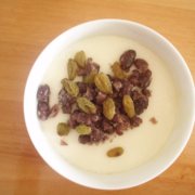 牛奶、蛋白、白糖、蜜豆、葡萄干。