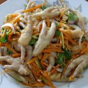 鸡脚、红萝卜、洋葱、姜、香菜、料酒、蚝油、麻油、盐焗粉、醋。