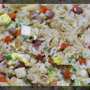 米饭、哈蜜瓜、叉烧、红辣椒、鸡蛋、葱花、姜容。