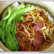 大米、广式腊肠、青菜、银鱼、青菜、花生油、生抽、美极鲜味汁、白糖、香油。