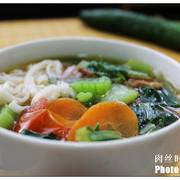 丝瓜、番茄、面条、小青菜、胡萝卜、肉丝、老抽、油、鸡汤、盐、味精。
