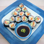 米饭、紫菜、熏三文鱼、牛油果、鸡蛋、寿司醋、芥末、生抽。