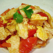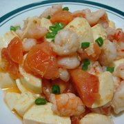玉子豆腐、虾仁、西红柿、盐、鸡精、姜汁、酒、生粉。