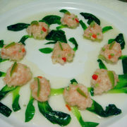 熟虾仁、上海青菜梗、盐、鸡精、生粉。