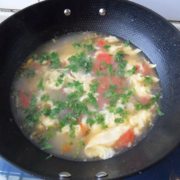 西红柿、鸡蛋、紫菜、海米、葱姜末、香菜末、面粉、盐、鸡精、油。