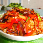 猪后腿肉、香干、鲜红椒、姜、蒜瓣、芹菜、盐、老抽、料酒。