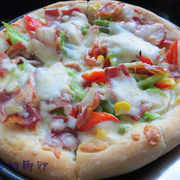 高筋面粉、酵母、糖、盐、水、橄榄油、番茄沙司、口蘑、青椒、红椒、洋葱、嫩玉米粒、青豆、培根、马苏里拉奶酪。