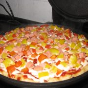 面粉、牛奶、面包粉、红甜椒、火腿、黄甜椒、发酵粉、番茄酱、沙拉酱、拉丝奶酪。