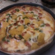 高筋面粉、温水、酵母、橄榄油、黄油、胡椒粉、糖、盐、香菇、马苏里拉芝士、菠萝罐头、青椒、玉米罐头、番茄酱、洋葱粒、西红柿。