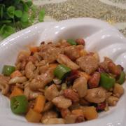 鸡腿、油炸花生米、胡萝卜丁、杭椒丁、葱粒、姜片、蒜片、料酒、水淀粉。