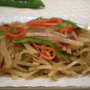 土豆丝、青椒、红辣椒、葱丝、姜丝、盐、醋、白糖、鸡精、植物油。