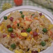 米饭、米饭、虾仁、香肠、胡萝卜、玉米粒、豌豆、鸡蛋、色拉油、盐、葱。
