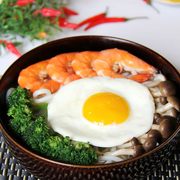 米粉、鲜虾、西兰花、鸡蛋、蟹味菇。