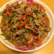 猪肉里脊、青椒、柿子椒、香菜、盐、鸡精、生抽、老抽、玉米淀粉、料酒、蒜片、姜。
