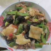 面粉、猪肉、西红柿、青椒、葱头、豆角、葱花、姜丝、蒜瓣、植物油、胡椒粉、酱油、盐、鸡精。