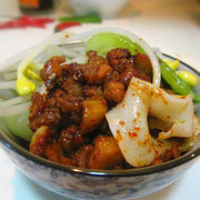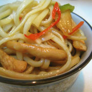 杏鲍菇、猪肉、面条、青红辣椒、胡萝卜、葱花、蒜瓣、生抽、白糖、盐、植物油、料酒。
