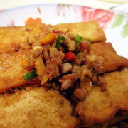 北豆腐、猪肉末、蒜瓣、大葱、郫县豆瓣酱、红油花生、糖、生抽。