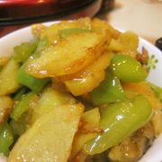 土豆、茄子、辣椒、大葱、蒜瓣、生抽、盐、淀粉、植物油。