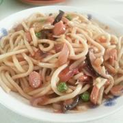 意大利面、土豆、火腿、香菇、洋葱、荷兰豆、番茄、香菜、生抽、冰糖、黑胡椒粉、番茄酱。