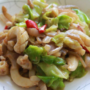 目鱼、包心菜、洋葱、大蒜、尖椒、料酒、酱油、盐、鸡精。
