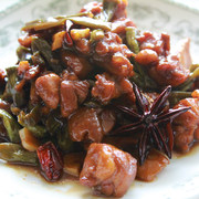 大鸡腿、长豆角、姜、蒜、干辣椒、八角、陈年糯米酒、酱油、鸡精、生粉。