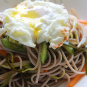 荞麦面、小黄瓜、海带丝、绿豆芽、胡萝卜、鸡蛋、虾酱、陈醋、香油、辣酱、老抽。