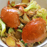 青蟹、花菜、年糕、葱、姜、蒜、小米辣、料酒、酱油、盐、鸡精。