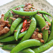 甜豆、肉丝、小米辣、蒜、料酒、酱油。