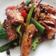 大排、蒜苗、辣椒、蒜、葱、生抽、老抽、料酒、盐、鸡精、糖。