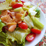 三文鱼、小番茄、黄瓜、生菜、鸡蛋、日本酱油、醋、芥末酱。