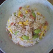 米饭、豌豆、鸡蛋、葱花、双汇火腿肠。