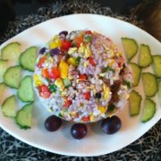 紫薯饭、鸡蛋、彩椒、黄瓜、香肠、食用油、香葱、盐。