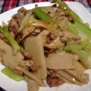 鲜笋、肉片、盐、姜丝、生抽、淀粉。