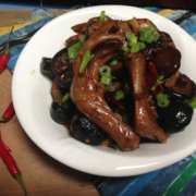 鸭掌、香菇、盐、姜、葱、蒜、香叶、八角、桂皮、山奈、花椒粒、干辣椒、生抽、老抽、醋、糖。