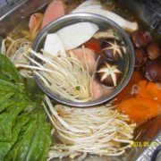毛肚、黄喉、金针菇、香菇、火腿肠、凤尾、胡萝卜、千张豆腐干、排骨、西红柿、西兰花、袋装火锅底料、姜。